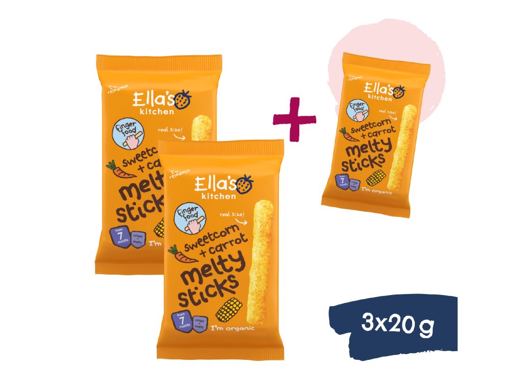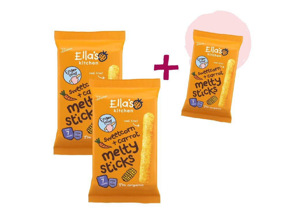 Paluszki ze słodkiej kukurydzy i marchewki zawierają tylko tyle cukru, ile słońce i natura wytworzyły go w ​​kukurydzy. Nie znajdziesz w nich grama więcej. Jednak w przeciwieństwie do innych paluszków mają jeszcze coś ekstra: dostosowaliśmy ich kształt do małych dłoni dzieci, aby mogły je łatwo chwycić i skierować bezpośrednio do buzi. I tam rozpłyną się na języku. Oprócz zabawy, dzieci ćwiczą chwyt i koordynację ręka-oko-buzia. Wszystko to w zabawny sposób i przy minimalnym bałaganie. Nadają się dla małych łasuchów od 7 miesiąca życia.