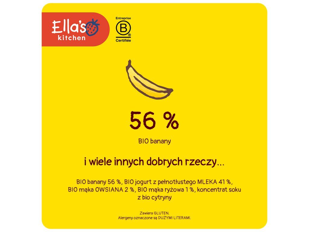 BIO banany 56 %, BIO jogurt z pełnotłustego MLEKA 41 %, BIO mąka OWSIANA 2%, BIO mąka ryżowa 1 %, koncentrat soku z bio cytryny