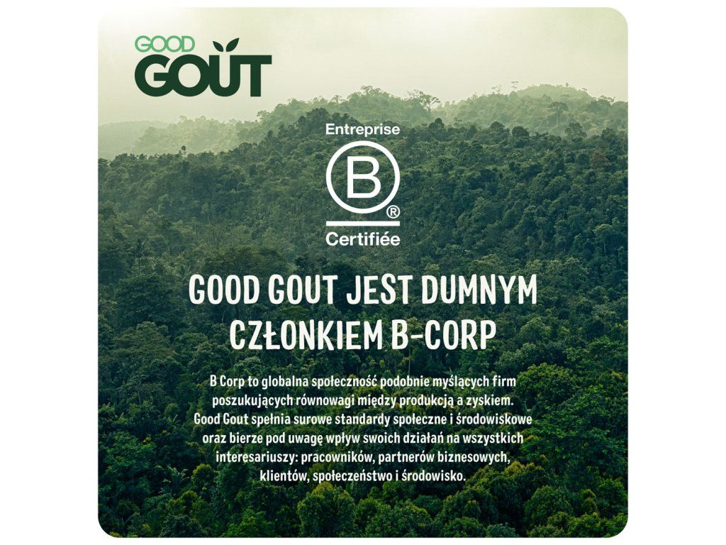 B-Corp to globalna społeczność firm o podobnych poglądach, poszukujących równowagi między produkcją a zyskiem. Good Gout spełnia surowe normy społeczno-środowiskowe i uwzględnia wpływ swoich działań na wszystkich interesariuszy: pracowników, partnerów biznesowych, klientów, społeczeństwo i środowisko.