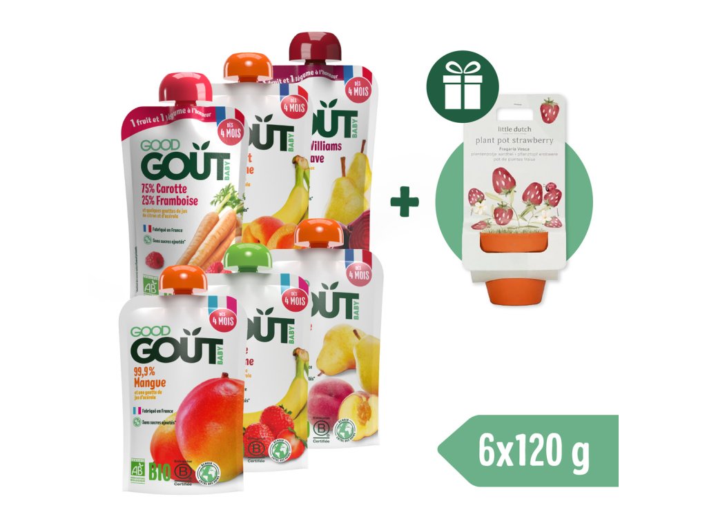 Przy zakupie specjalnego 6-paku musów Good Gout otrzymasz w prezencie doniczkę z nasionkami truskawek od Little Dutch!
